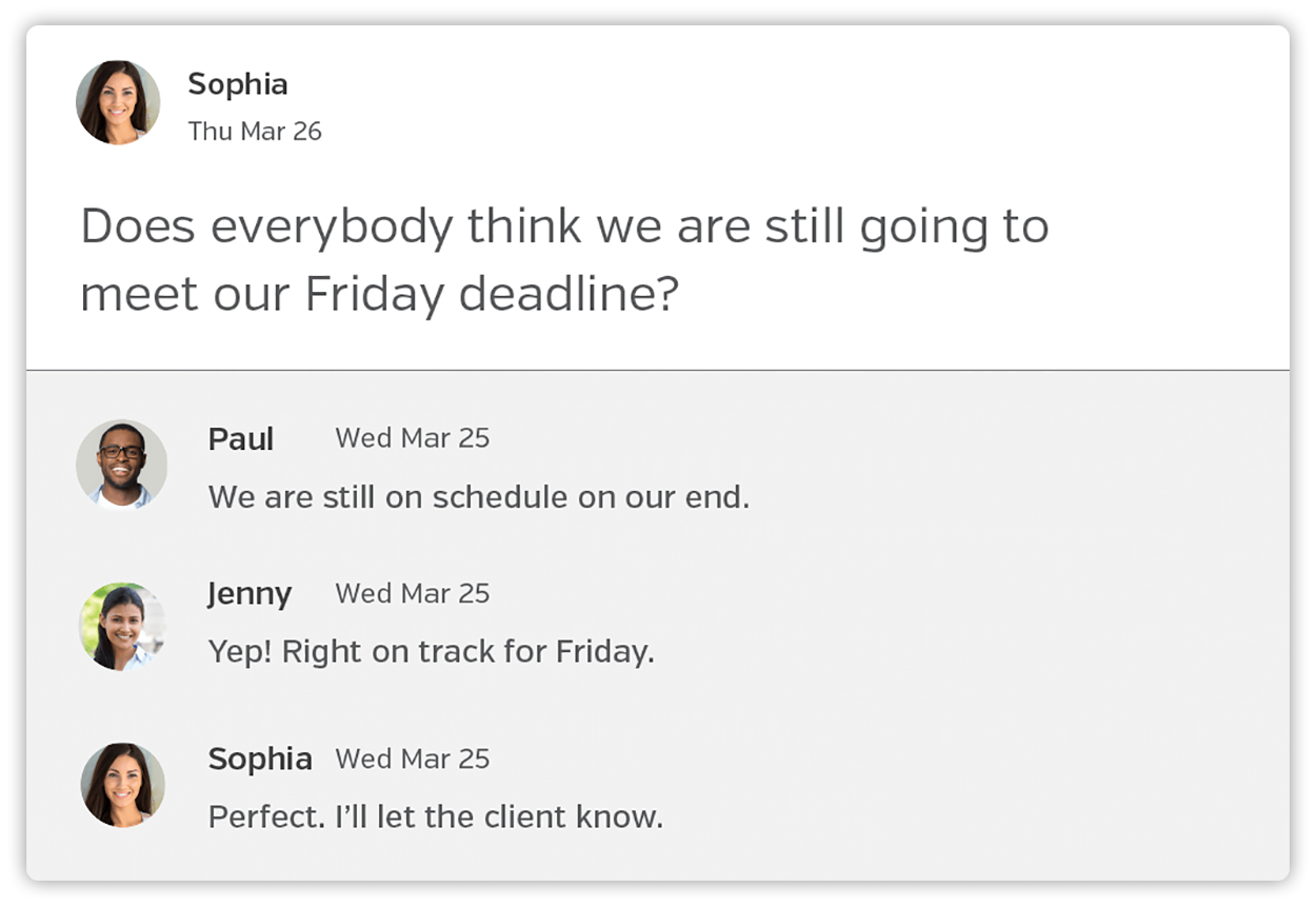 Get your team lined up on every project. In Projects, each team member automatically has access to the Spaces and files that are a part of that Project.