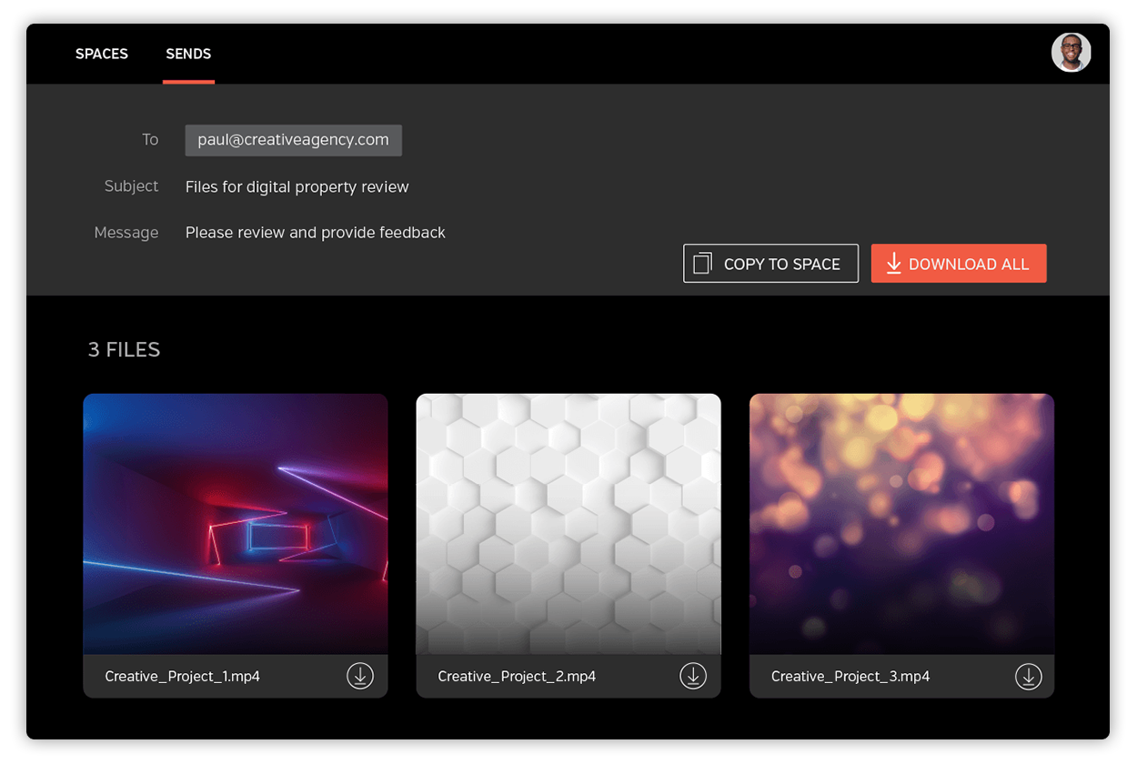 Store and organize your files in Spaces, which are visual folders, and share out a link to your Space for recipients to view multiple files at once.